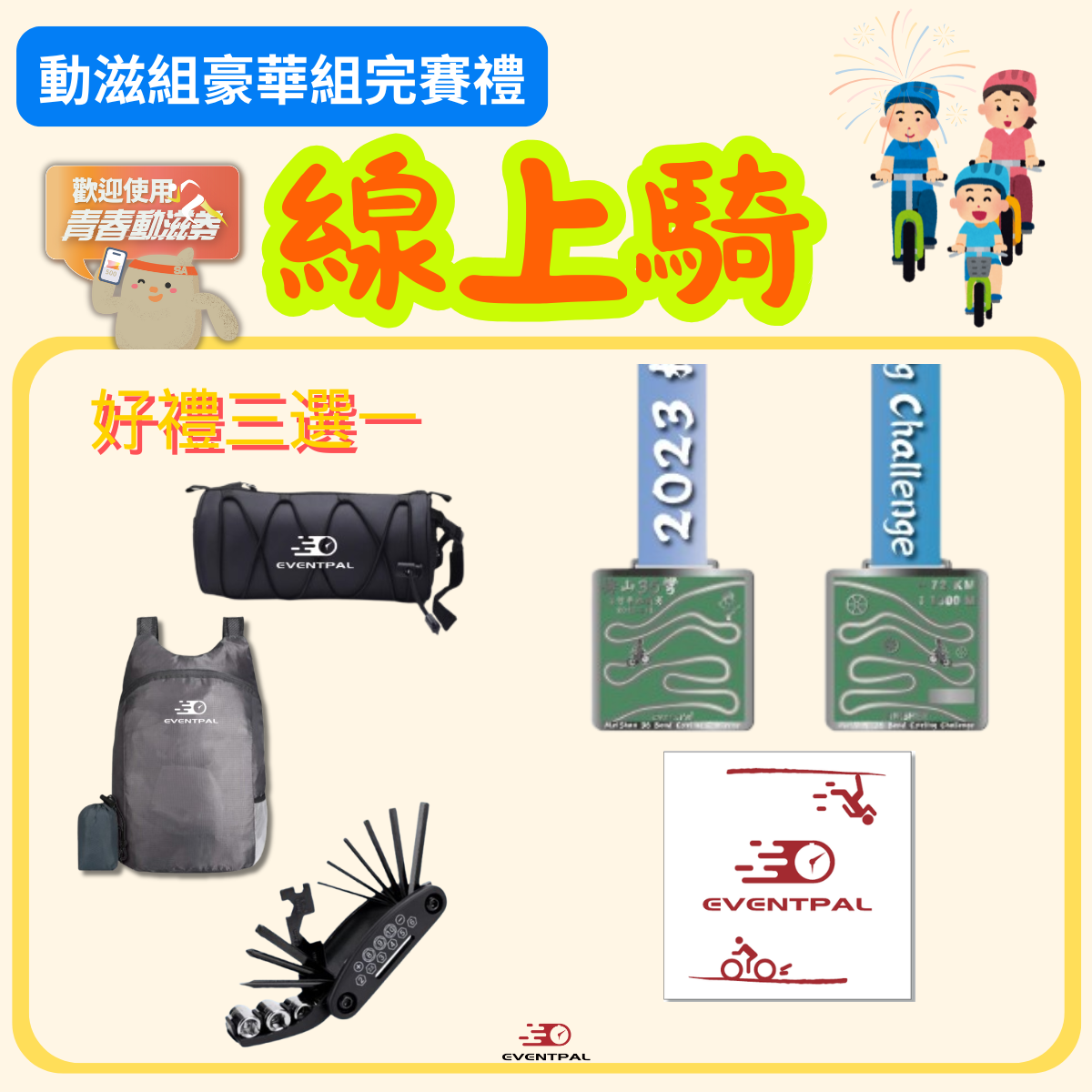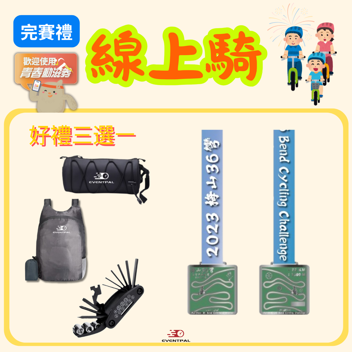 指定賽事雷雕姓名獎牌+摺疊後背包、單車滾筒包、多功能板手組(三選一)+完賽證書