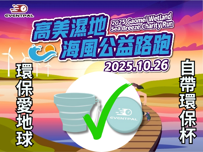 2025 高美濕地海風公益路跑賽提倡環保,請參賽者盡量自備環保杯,減少一次性塑膠使用,讓我們一起愛護濕地與地球!